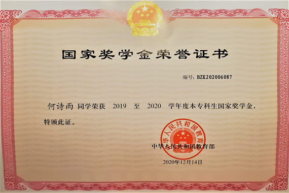 祝贺何诗雨同学荣获2020年本科生国家奖学金。