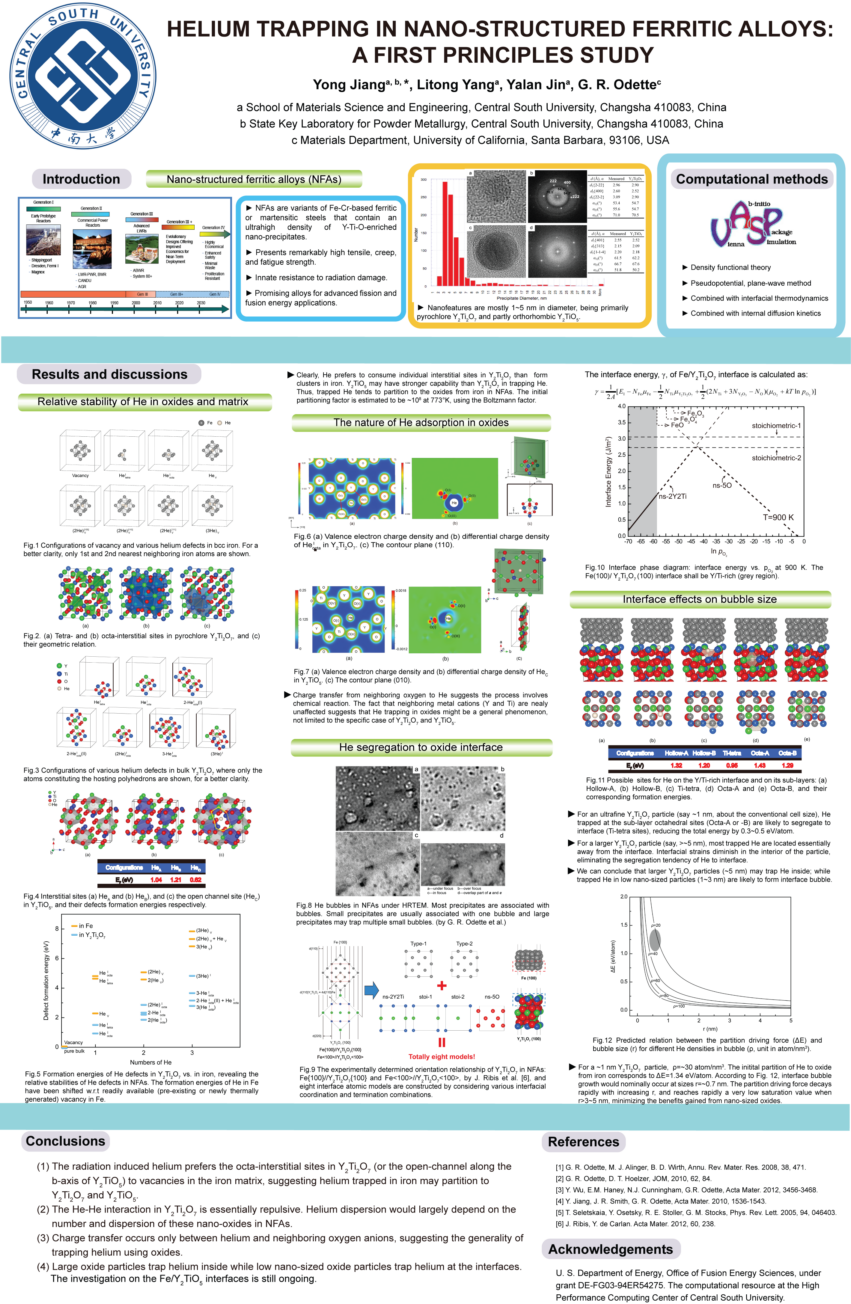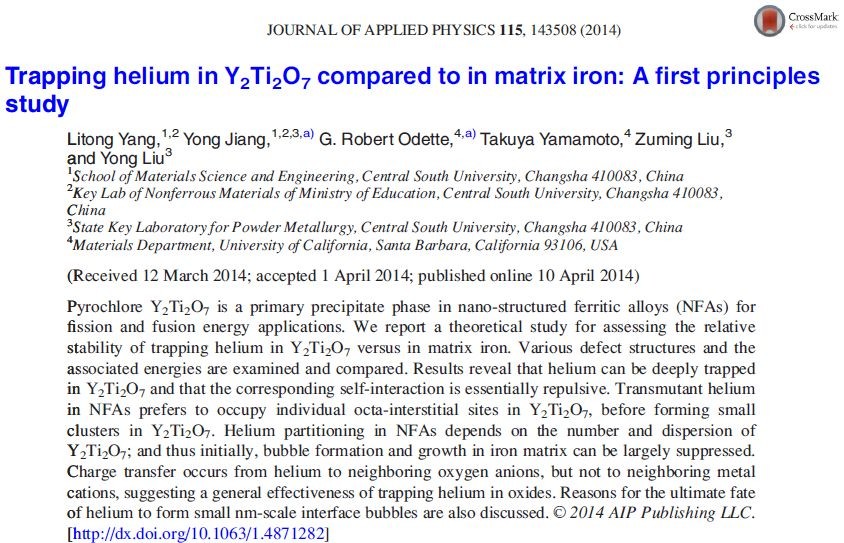 祝贺张建宁博士撰写的论文被《Journal of Applied Physics》接收(影响因子2.877)。该论文从第一性原理出发,计算了Y-Ti-Zr-O纳米氧化物的体相取代和界面偏析,探讨了核壳Y-Ti-Zr-O纳米氧化物的形成和稳定性。---link