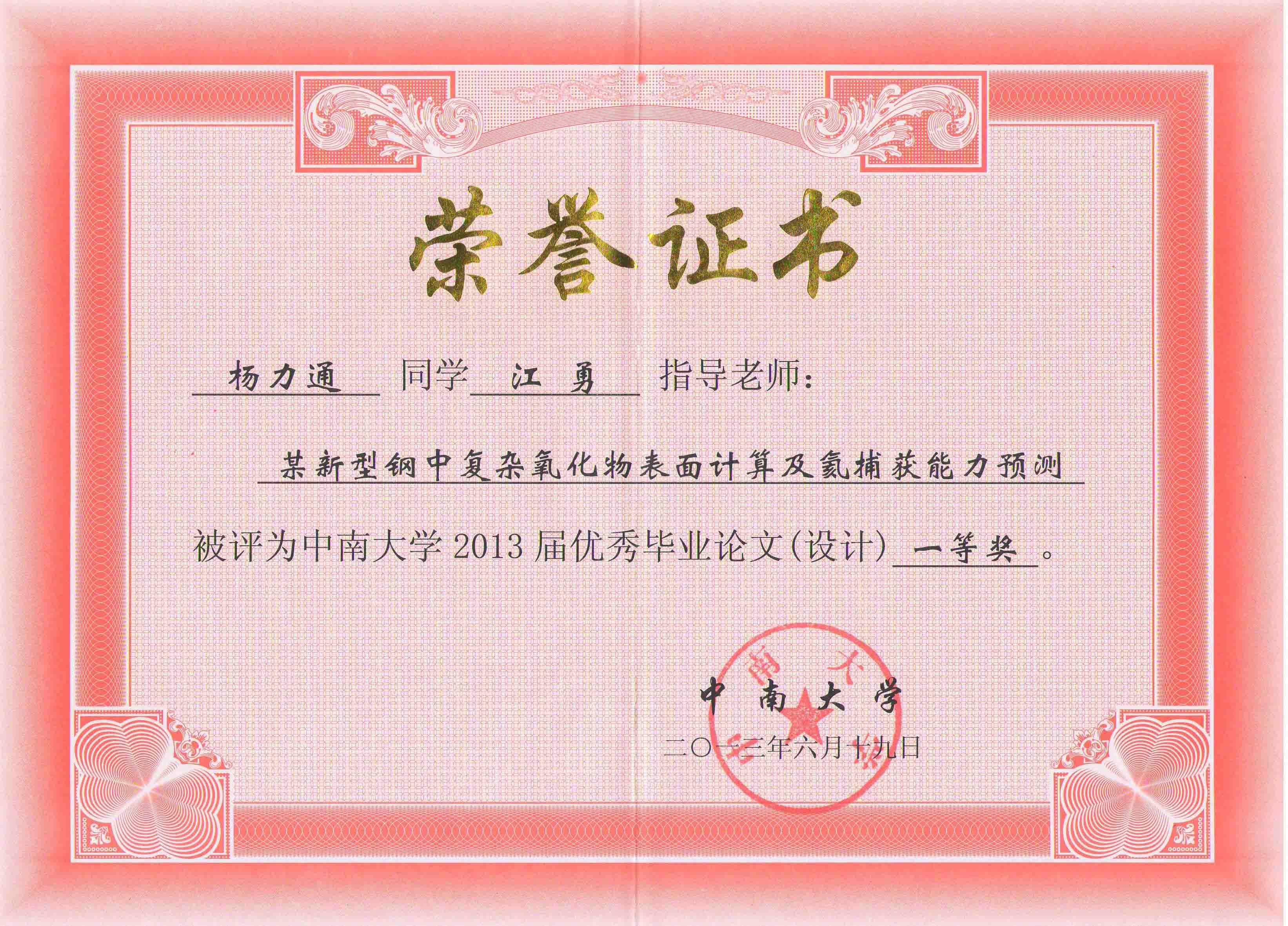 祝贺本组杨力通同学和徐健同学于中南大学材料领域第十二届研究生会学术年会中分别获得一等奖和三等奖