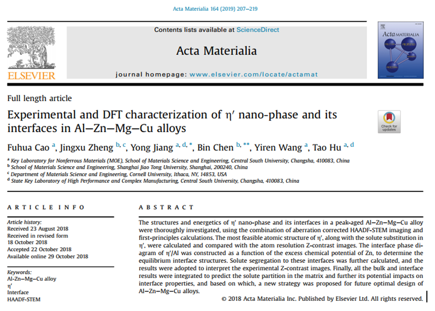 祝贺博士生曹富华同学撰写的论文发表在期刊《ACTA Mater》上!论文研究7系超高强铝合金中主要强化相η’相的界面相图和主合金元素的界面行为。ACTA Mater是材料科学与工程类的顶级期刊之一(影响因子6.036)。---link