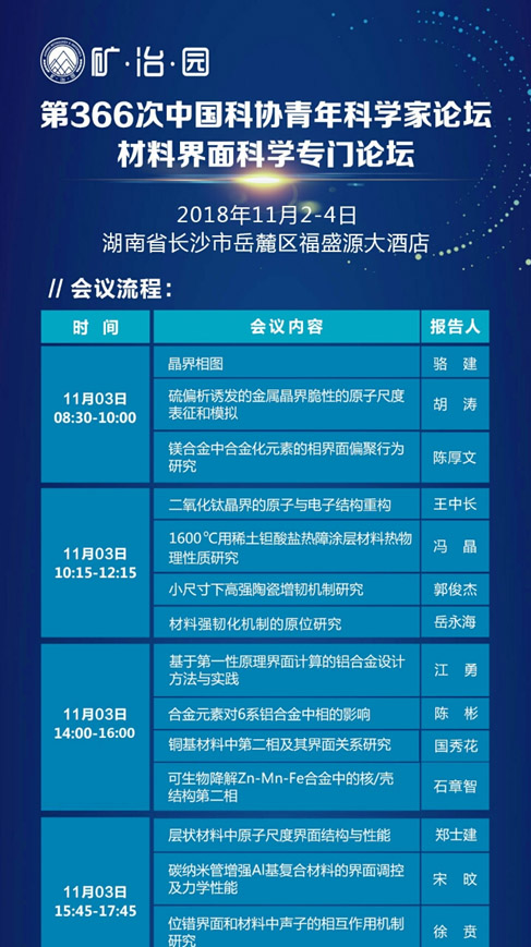 - 2018/11/2-4: Prof. Jiang chairs the 366th Youth Scientist Forum of Chinese Association for Science and Technology with special topics on Materials Interface Science on Nov. 2-4th at Central South University. Prof. Hu and Jiang delivered two invited talks.