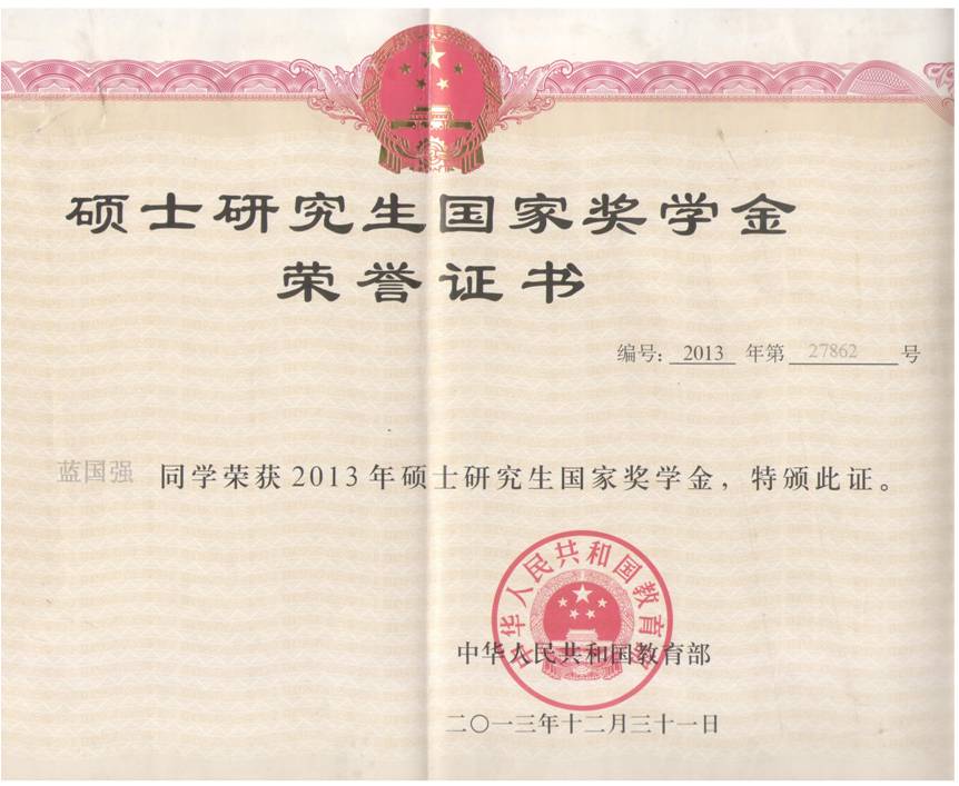 - 祝贺研二杨力通同学荣获2014年度国家研究生奖学金!
