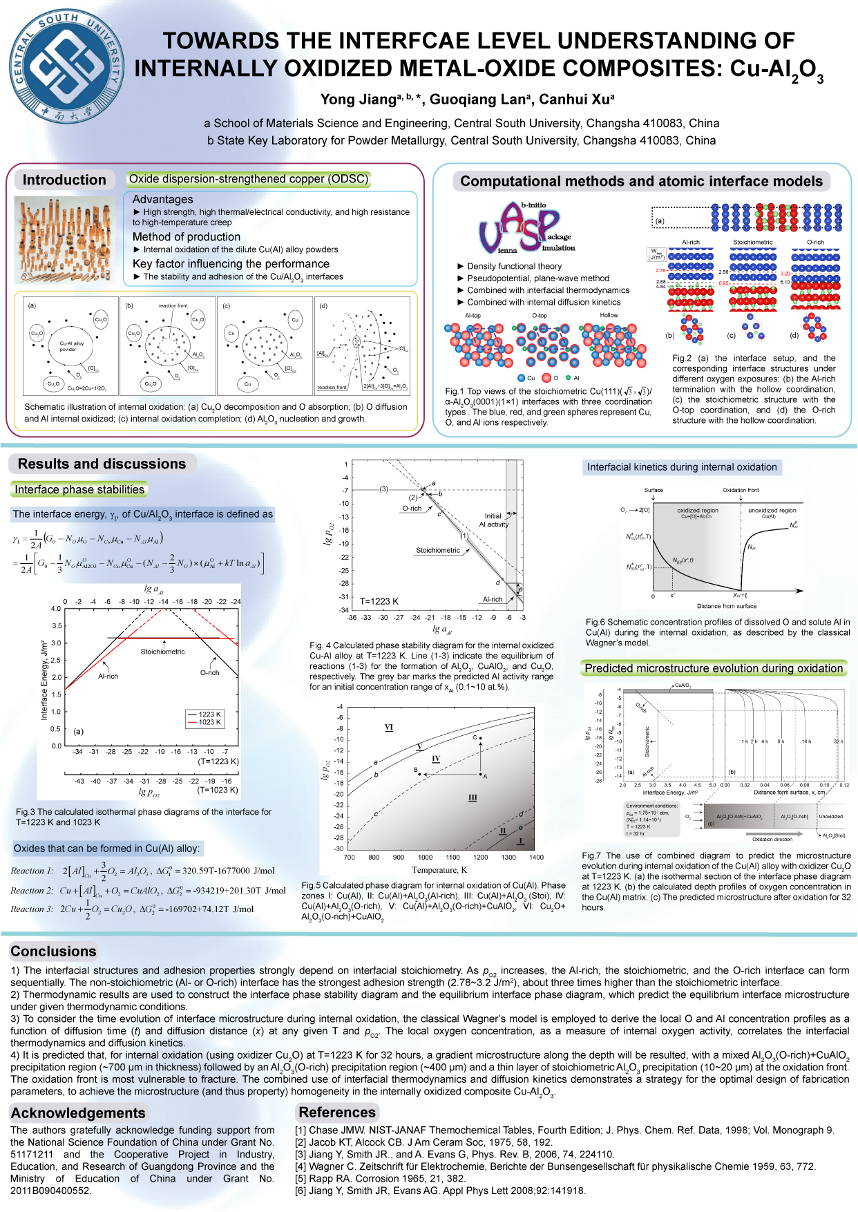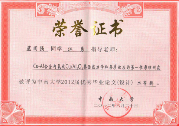 - 2018/12/31: Congratulations to Fuhua Cao for his paper “Experimental and DFT characterization of h0 nanophase and its interfaces in AleZneMgeCu alloys” winning the First place at 2018 "Young Pioneers Forum in Materials Science and Engineering in Hunan Province".
