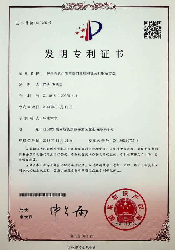 | 祝贺硕士生田云同学的发明专利《一种具有负介电常数的金属陶瓷及制备方法》国家知识产权局正式受权。 |