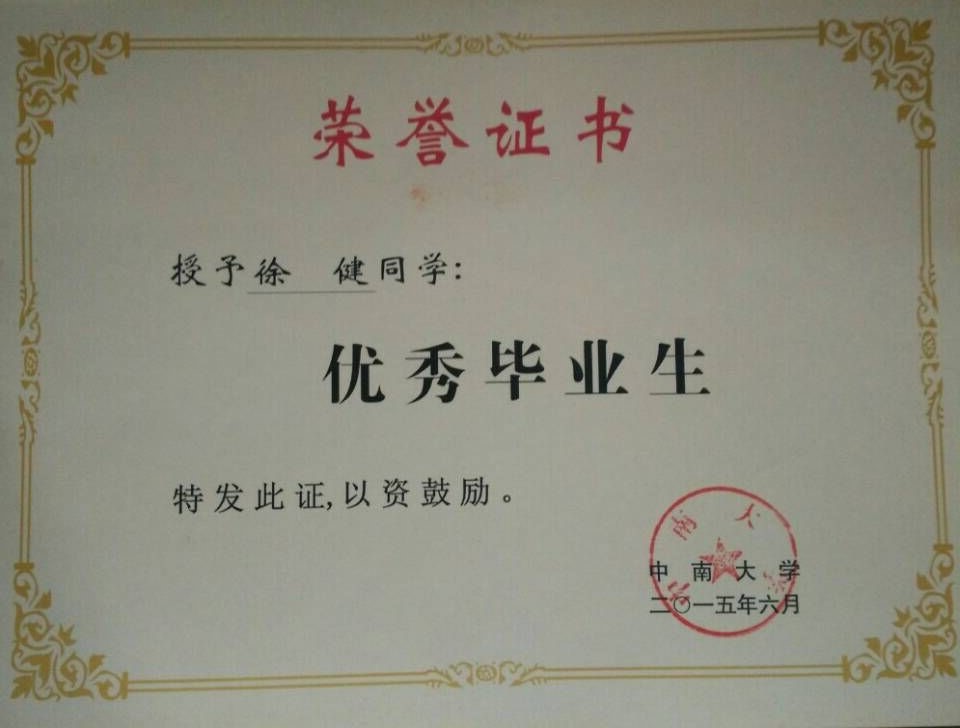 祝贺徐健同学获得中南大学优秀毕业生奖以及优秀毕业论文一等奖!