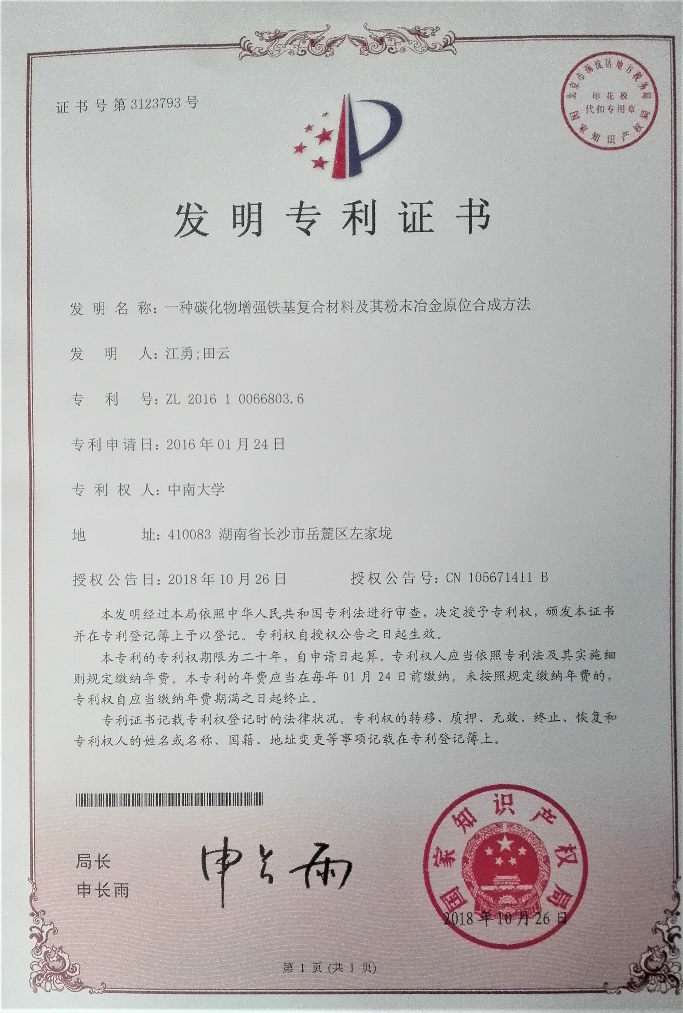 祝贺硕士生田云同学的发明专利《一种碳化物增强铁基复合材料及其粉末冶金原位合成方法》被国家知识产权局正式授权。
